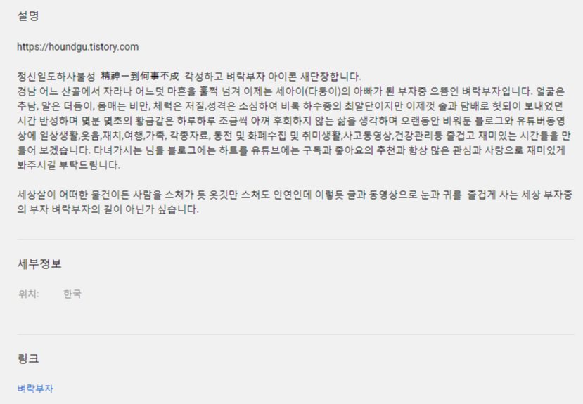 https://houndgu.tistory.com 정신일도하사불성 精神一到何事不成 각성하고 벼락부자 아이콘 새단장합니다. 경남 어느 산골에서 자라나 어느덧 마흔을 훌쩍 넘겨 이제는 세아이(다둥이)의 아빠가 된 부자중 으뜸인 벼락부자입니다. 얼굴은 추남, 말은 더듬이, 몸매는 비만,...