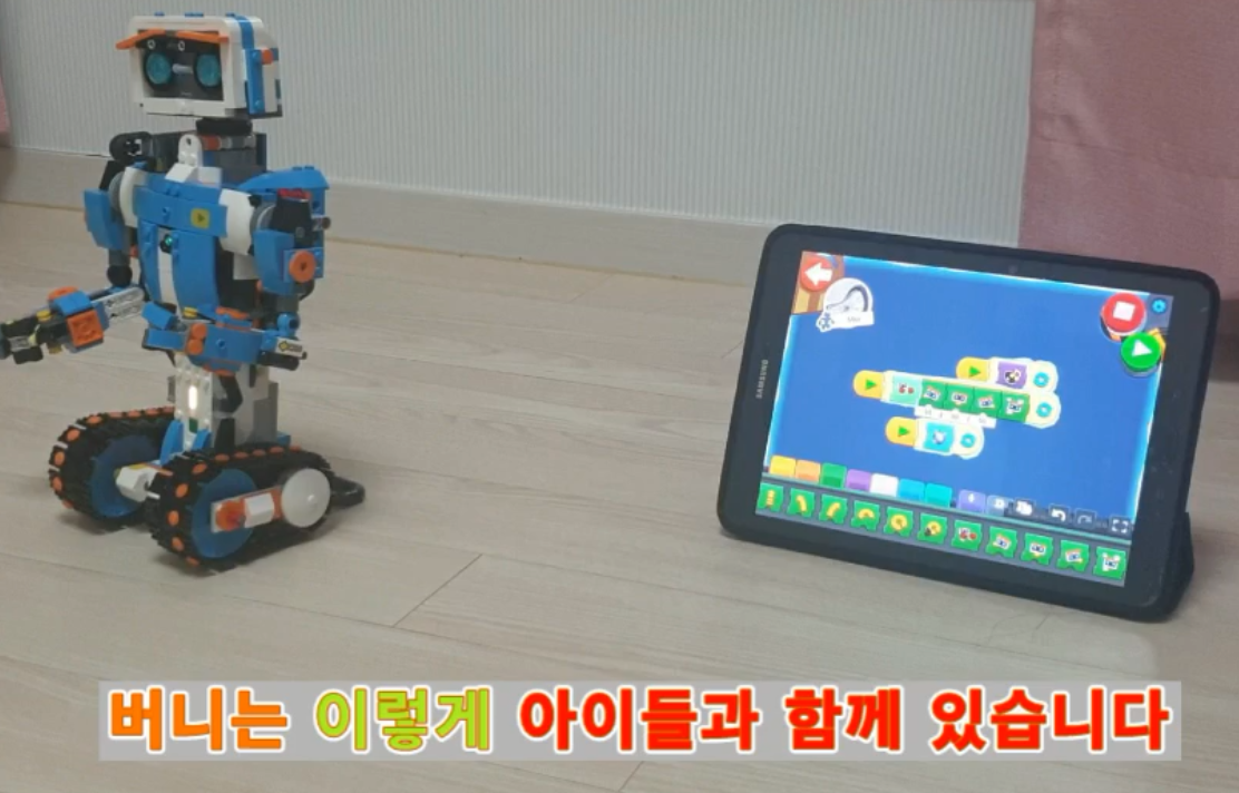 버니의 구동은 사진과 같이 탬블릿 PC 텝 또는 스마트폰에 구동 연결 코딩 프로그램(어플) 설치하고 움직일 수 있게 코딩 방향 조절 기능을 눌러 움직이게 합니다. 버니의 행동 한번 지켜봐 보세요. 웃깁니다.