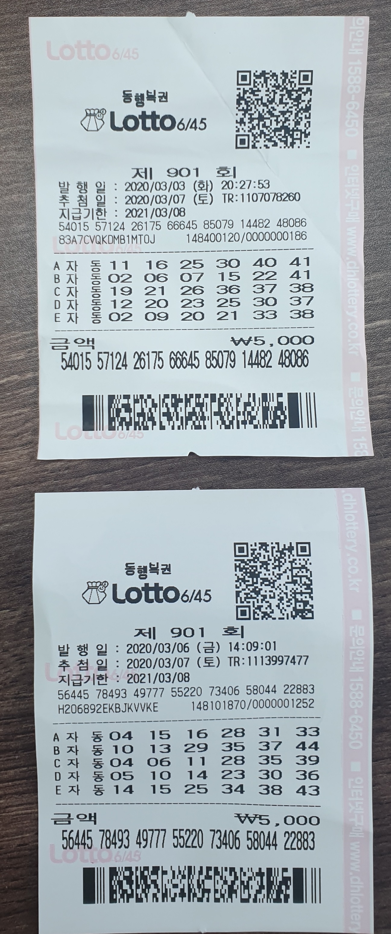 5000원씩 나름 명당이라는 곳에서 들러 구입한 복권 예상번호입니다.