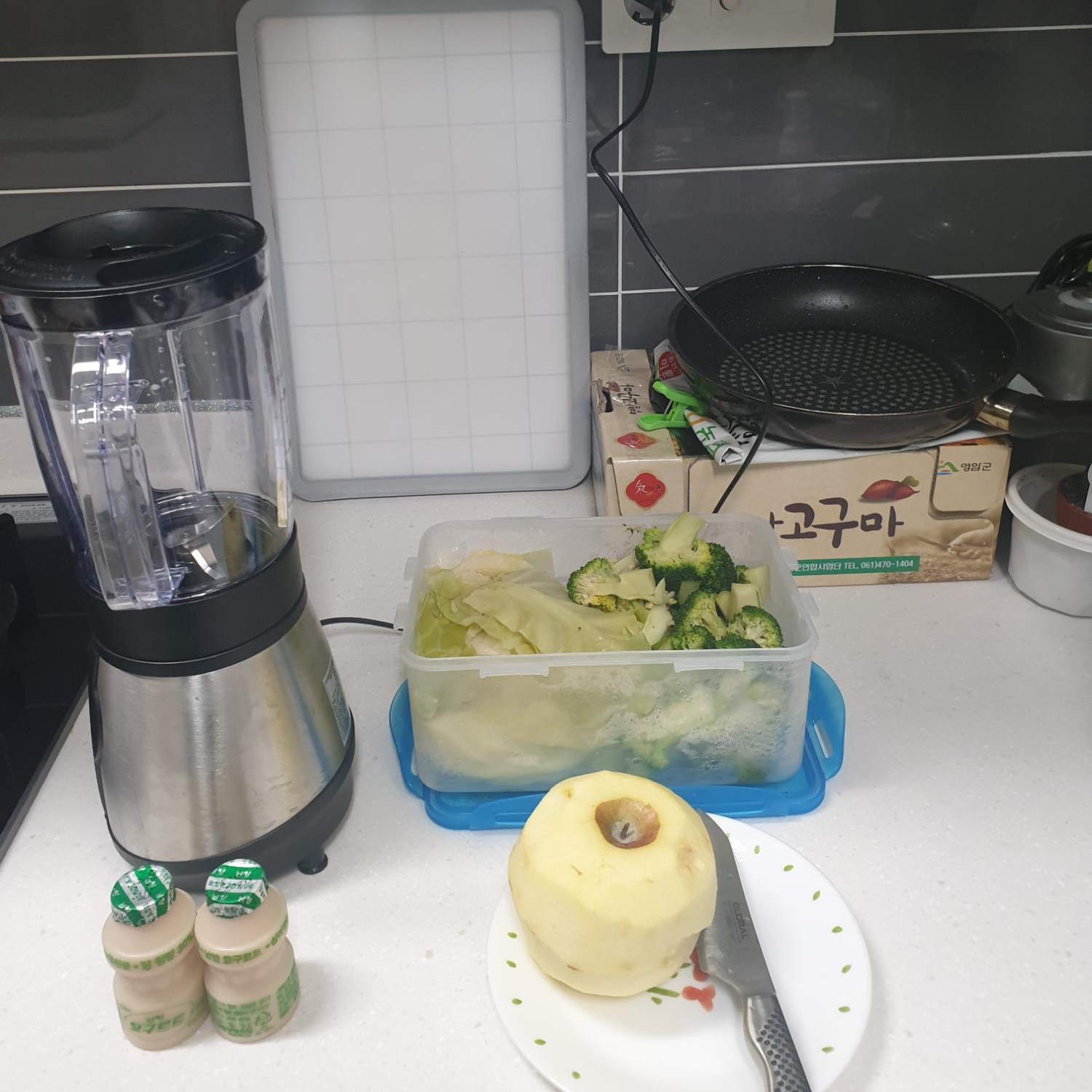 사전에 깨끗한 물에 데쳐놓은 양배추 브로콜리 사과 반개 요구르트 2개를 준비합니다.