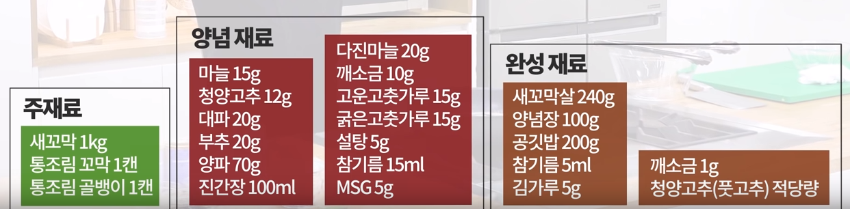 새꼬막, 고춧가루, 진간장, 설탕, 부추, 양파, 다진 마늘, 대파, 참기름, 마늘, 청양고추, 깨소금, 김가루 등