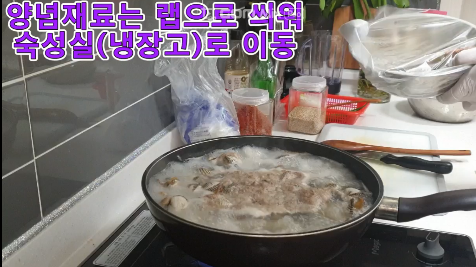 이제 잘 만들어진 양념장은 랩 포장하여 숙성실(냉장로)에 보관합니다. 숙성이 되어야 당연히 맛있겠 죠?