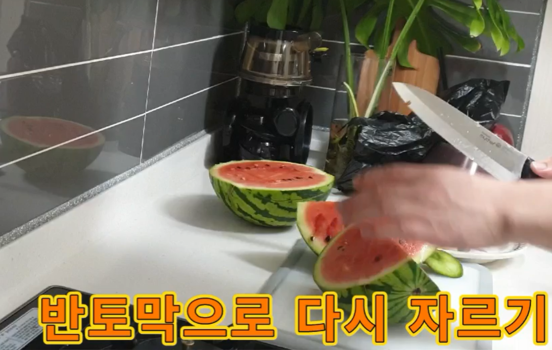 이제 남은 수박 다시 한번 더 가로 세로 자르기 신공 들어가시면 됩니다. 가로로 쫘~악 세로로 쫘~악