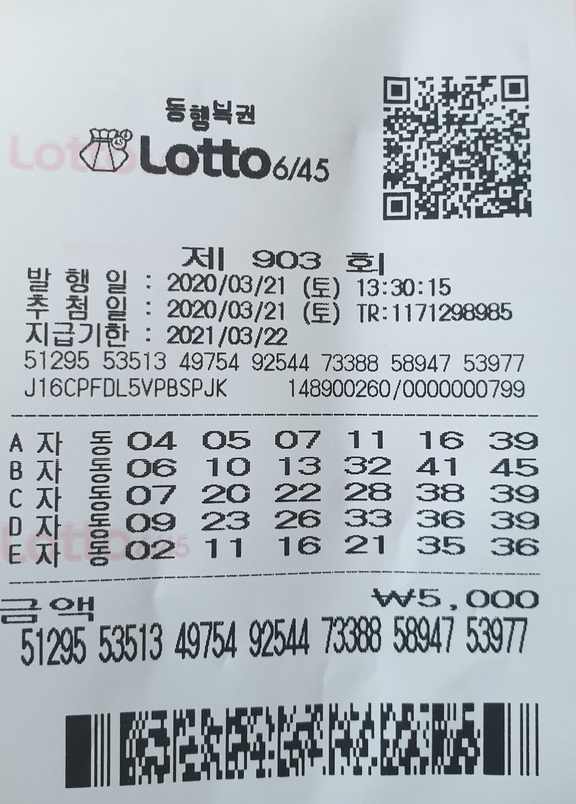 로또 동행 복권 903회 예상번호 무료 나눔 합니다.