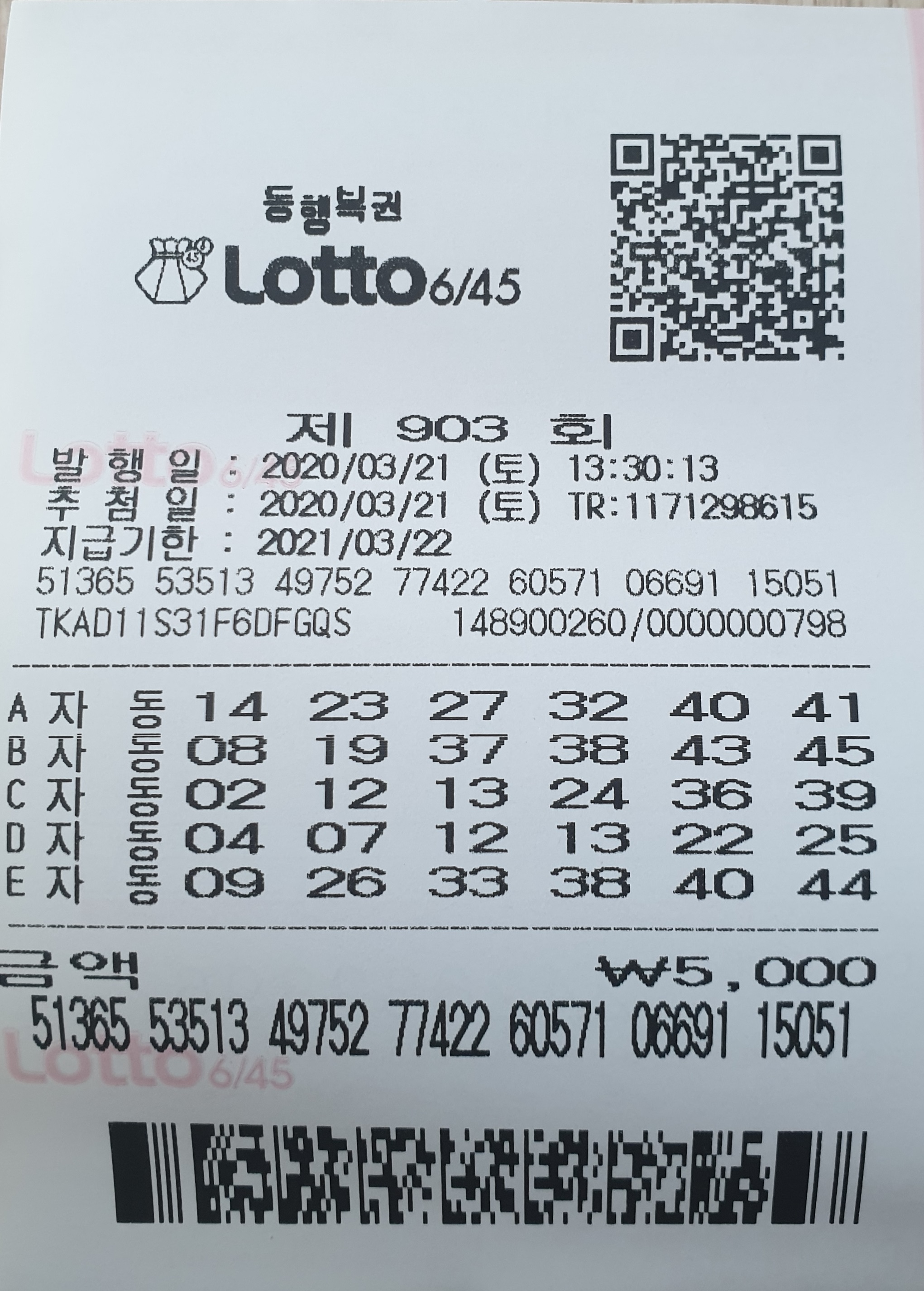 연금복권도 제455회 당첨 1,000원을 포함하여 제456회 추첨일 2020.03.25일 발표하는 4조 7장 구입하였습니다.