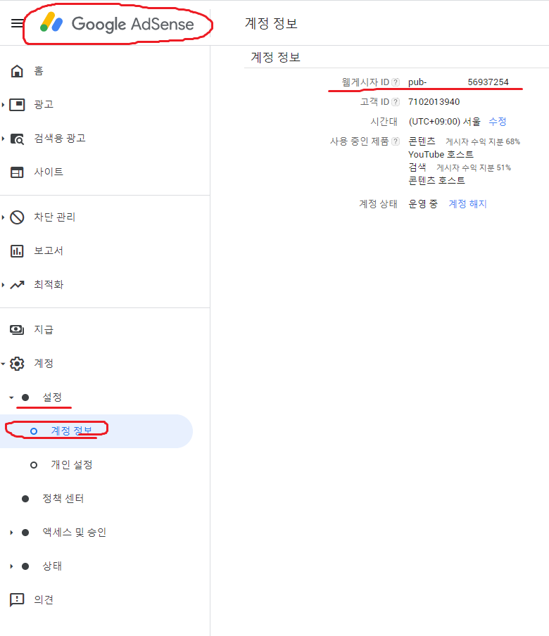 9. 구글 애드센스 설정 > 계정정보 > 웹 게시자 ID 복사합니다. 실제 게시자 ID 식별번호입니다.