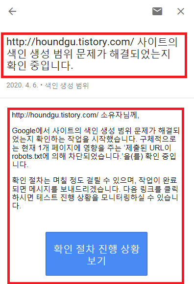 16. 아래의 메시지를 알림으로 받아보실 수 있을 거예요. 해당 사이트의 색인 생성 범위 문제가 해결되었는지 확인하는 작업 시작했습니다라는 기분 듣기 좋은 내용입니다.