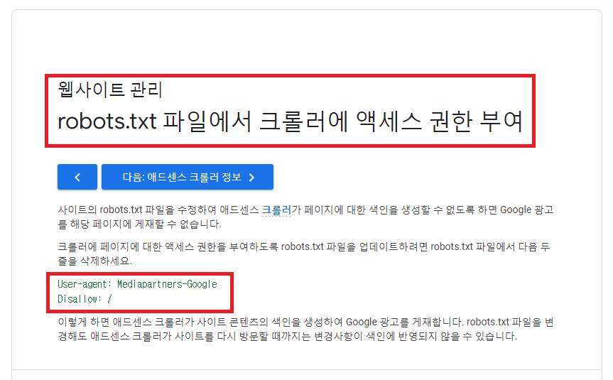 8. 웹사이트 관리 robots.txt 파일에서 크롤러에 액세스 권한 부여라는 내용으로 파일의 다음 두줄을 삭제하라는 내용이 나옵니다. 하나하나 체크해봅니다.