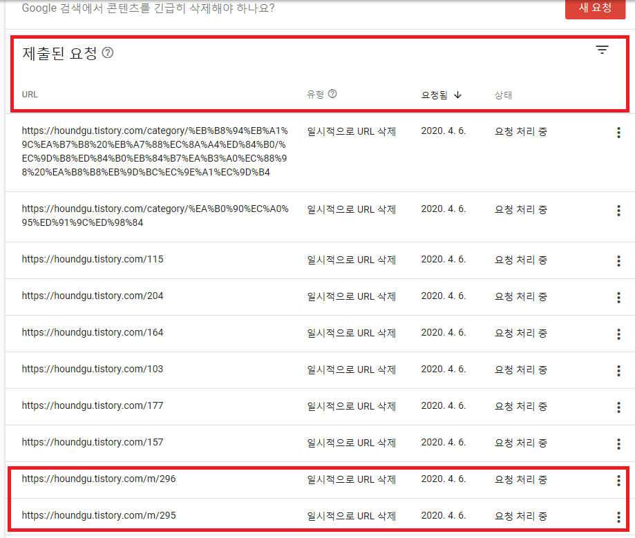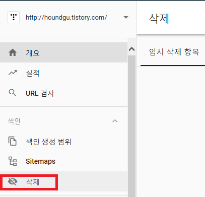 5. 구글 서치 콘솔(google search console) 혹은 구글 웹마스터 도구 검색해서 로그인 후 해당 삭제 버튼 찾습니다.