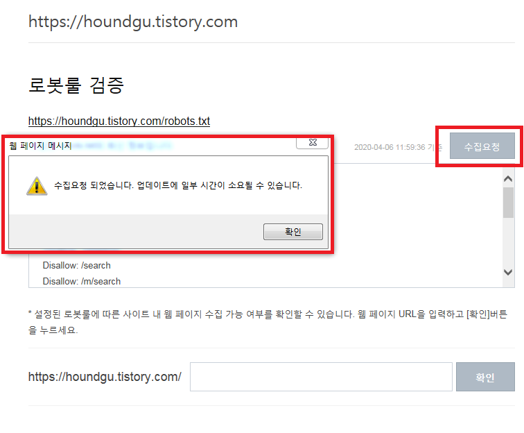 14. 본인의 오류 났던 블로그 주소 입력하시면 수집이 가능하다는 메시지 나타납니다.