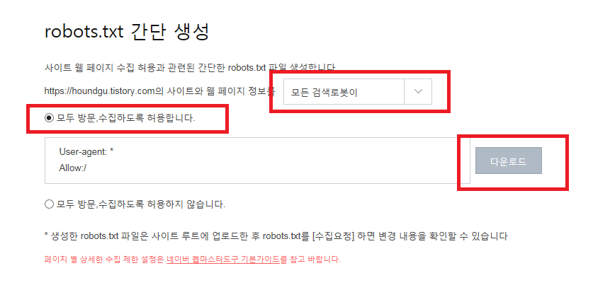 10. 하단과 같이 robots.txt 간단 생성 파일을 만들어주세요.