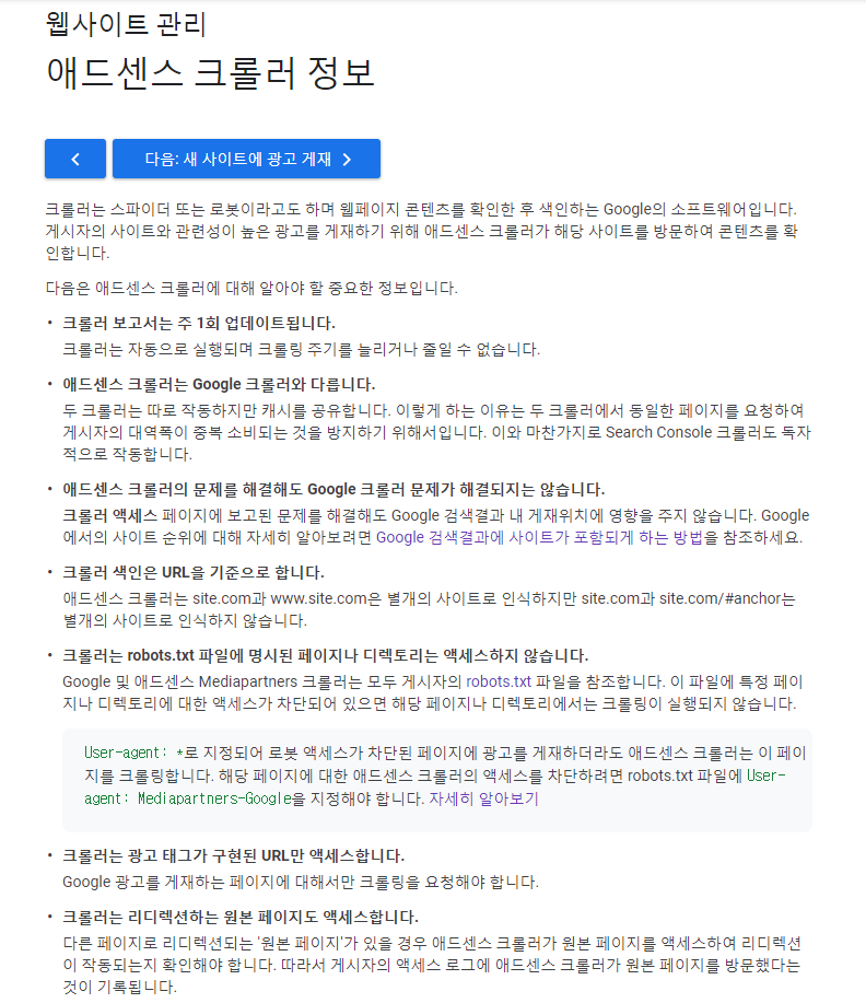 게시자의 사이트와 관련성이 높은 광고를 게재하기 위해 애 든 센스 크롤러가 해당 사이트를 방문하여 콘텐츠를 확인하는 즉, 구글 애드센스가 블로그를 확인하겠다는 내용입니다. 이걸 어떻게 해야 해야 할지?