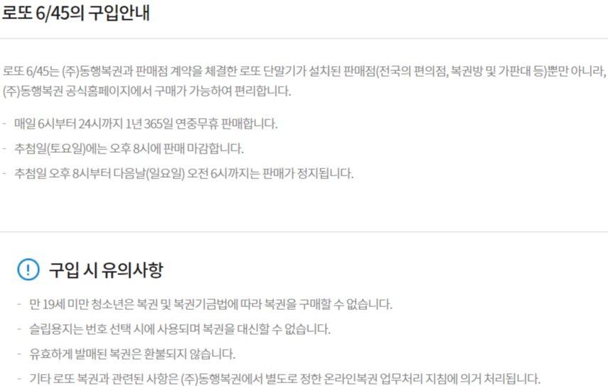 추첨일 오후 8시부터 다음날 일요일 오전 6시까지는 판매가 정지됩니다.