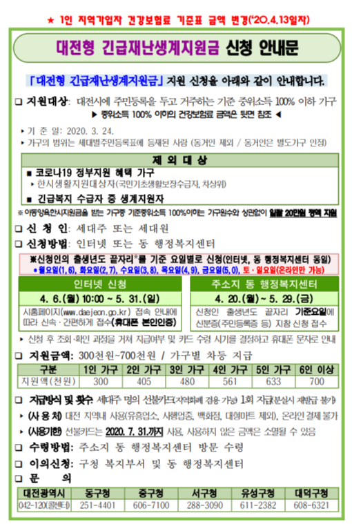 대전광역시 코로나 19 국가 지원 긴급재난생계지원금 종합지원대책사업 신청 안내