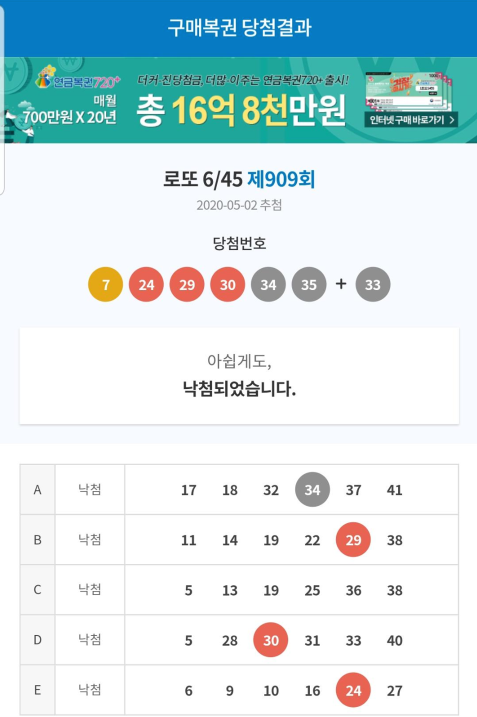당첨번호 7 24 29 30 34 35+보너스 33