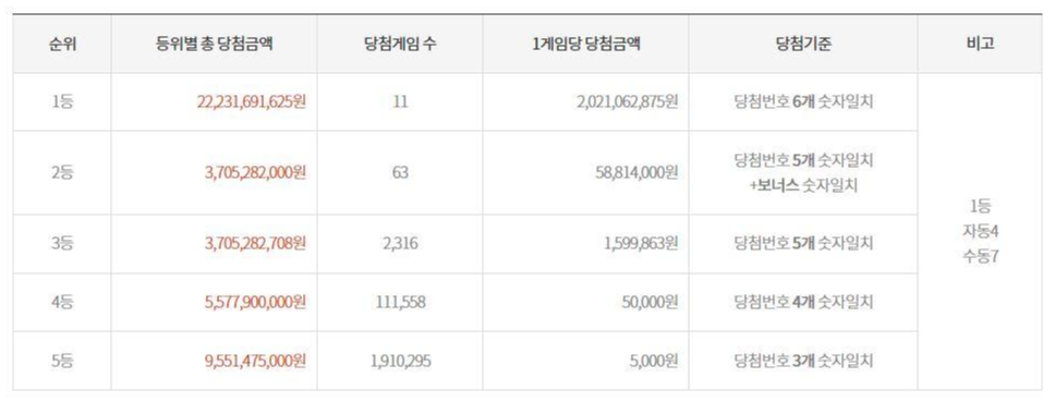 1등, 2등, 3등, 4등, 5등 당첨금액.