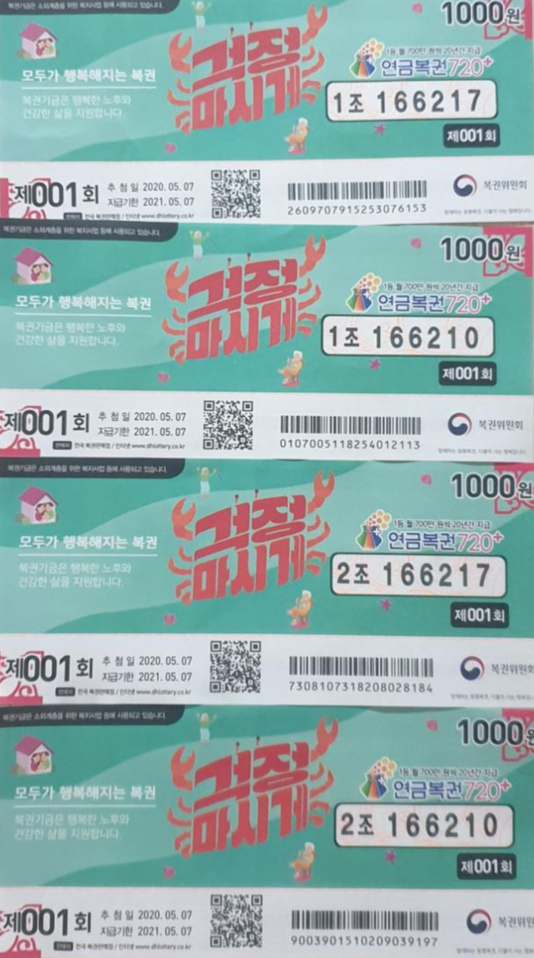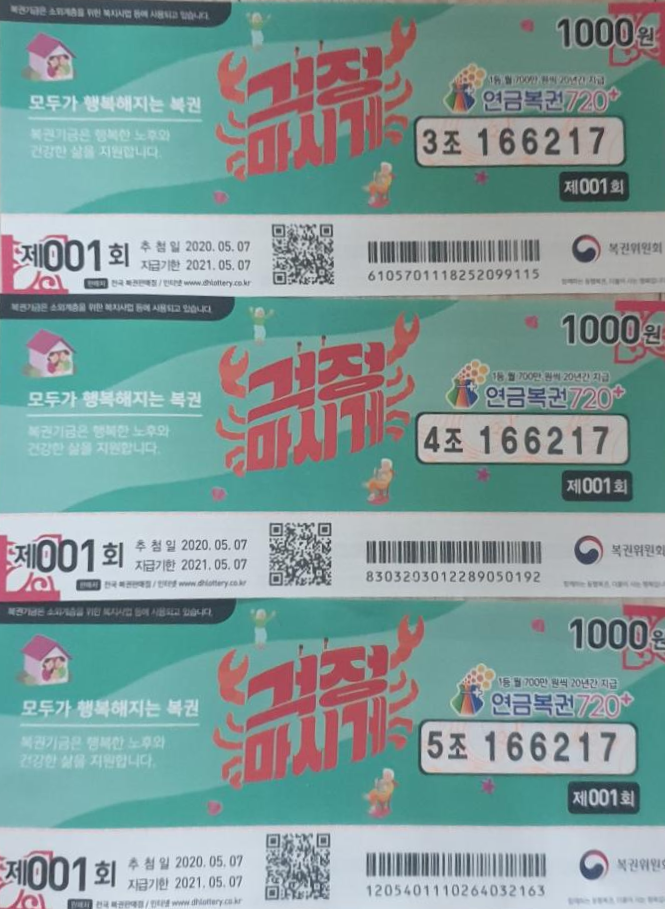 연금복권 720+ 제001회는 버리지 말고 모아 놓아야겠습니다. 001이라는 숫자는 너무 이쁘고 좋은 번호입니다.