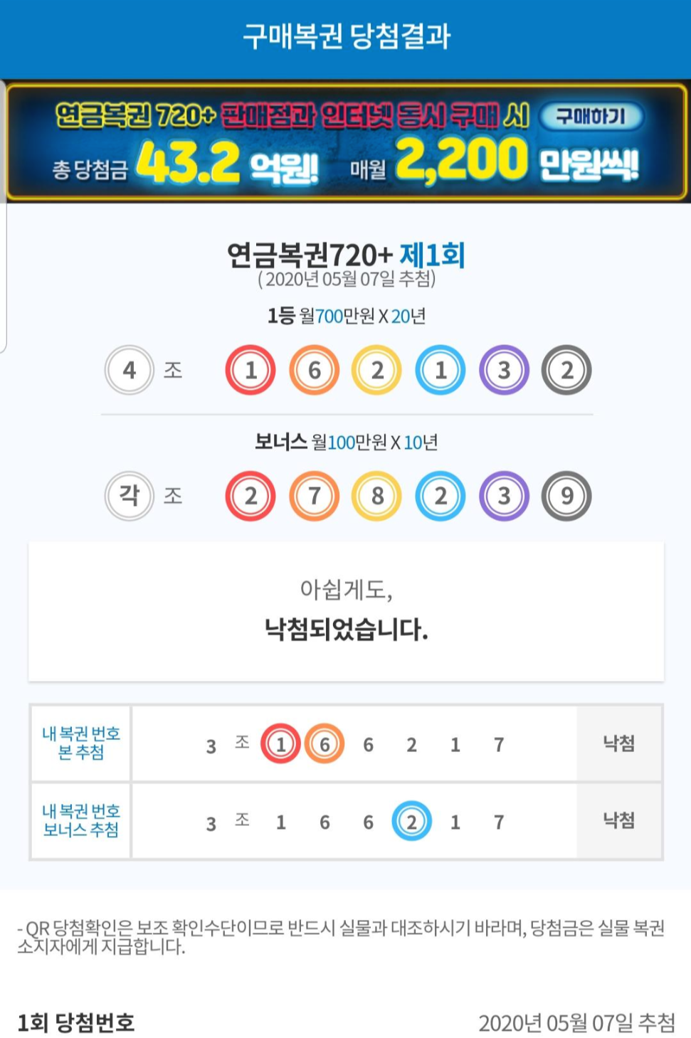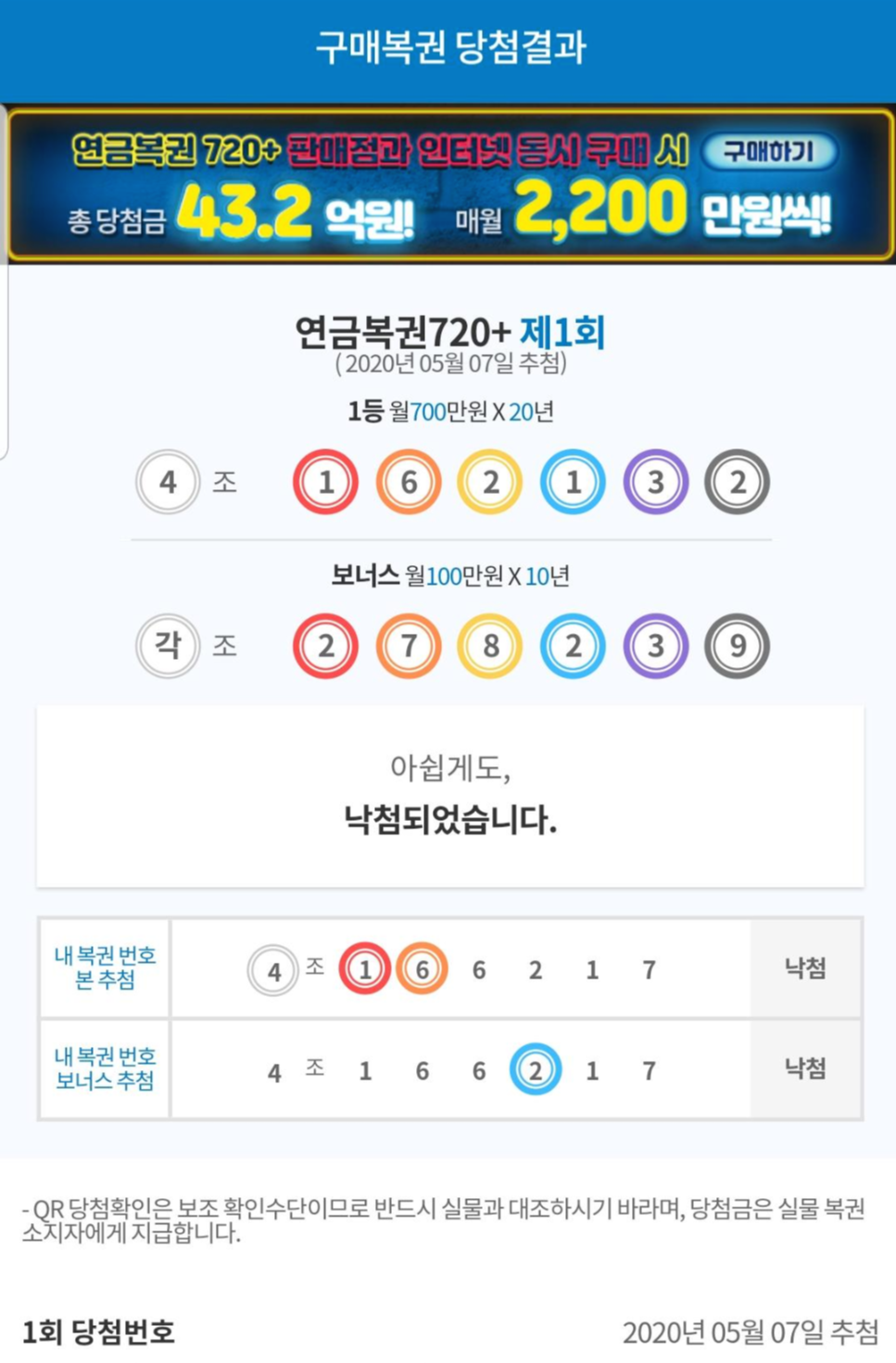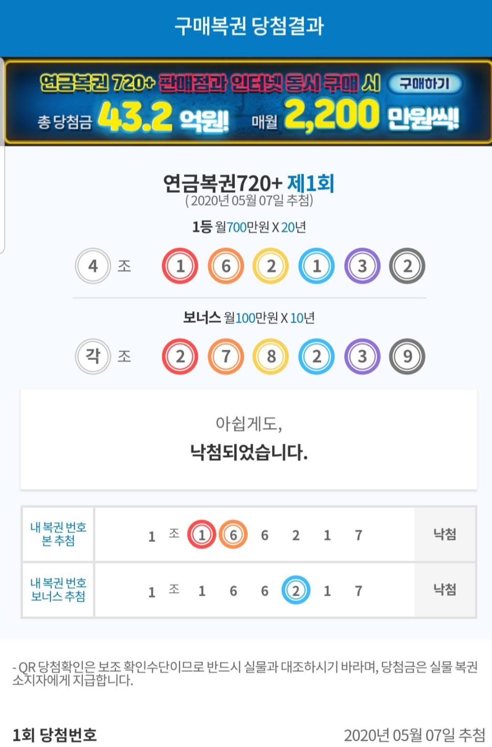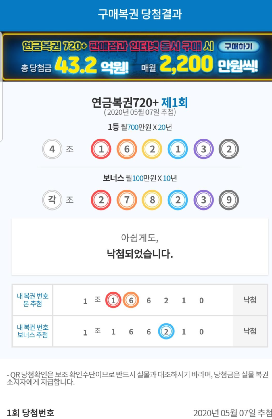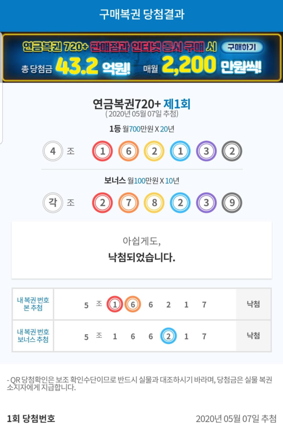 직접 구입한 연금복권 720+ 결과 한번 맞추어 봅니다. 제발.
