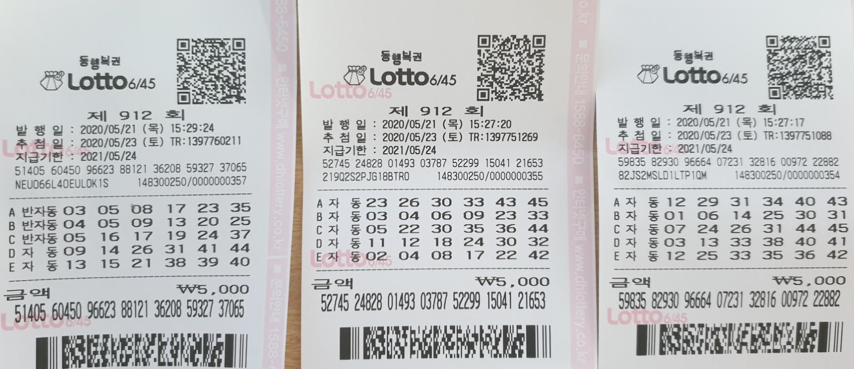 20년05월23일추첨 국민 로또 제912회부자 지름길 당첨결과.