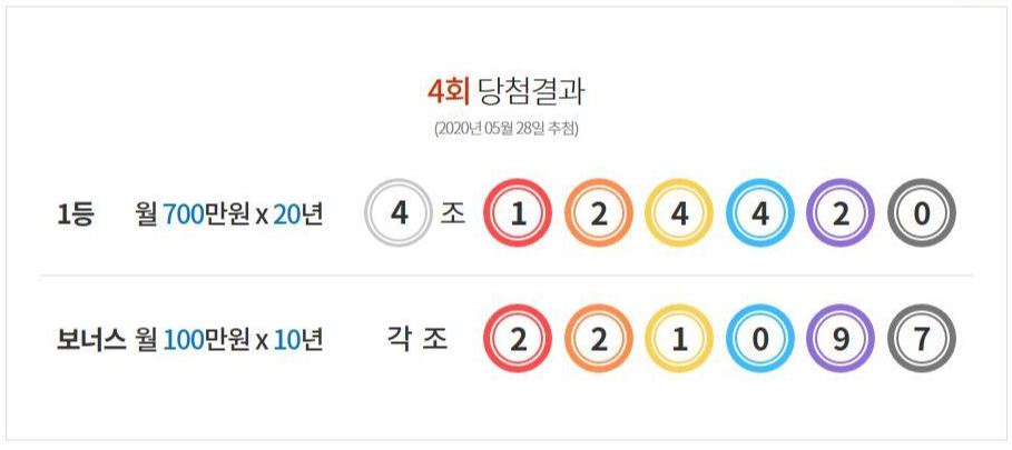 | 연금복권 720+ 제005회 당첨번호 로또 와 예상 행운의숫자 받아보기 (0) | 2020.06.04 |