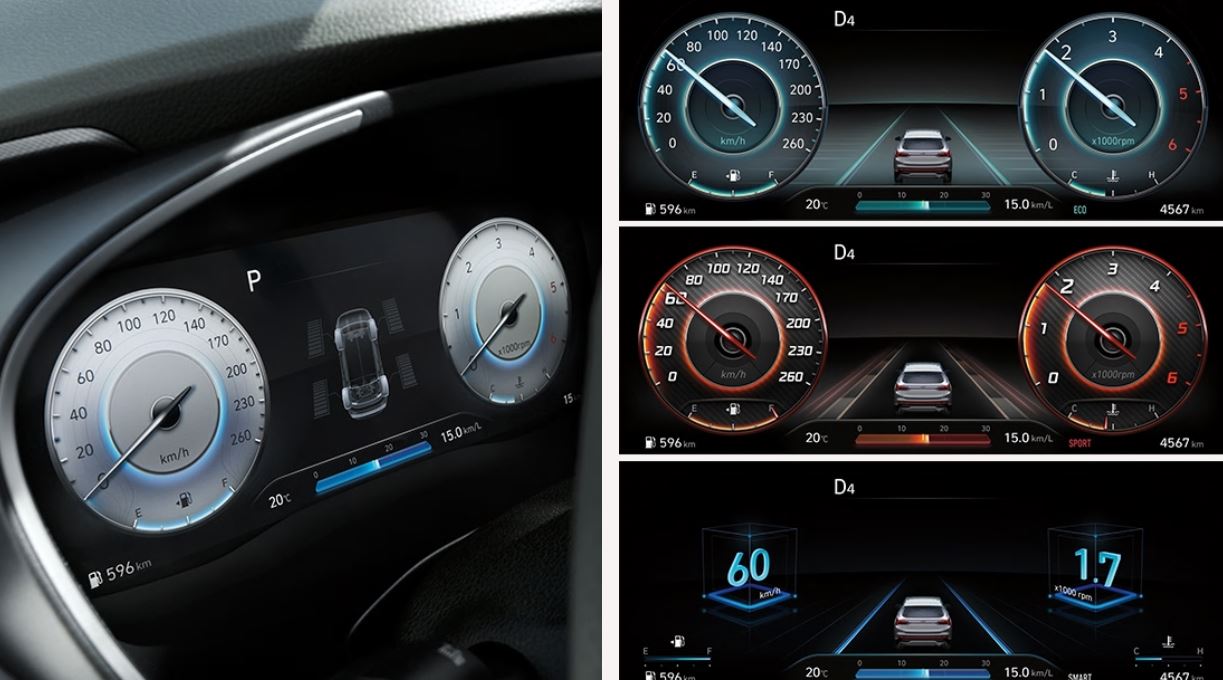 고해상도 12.3인치 Full LCD 클러스터를 적용하여 싼타페의 하이테크 한 이미지를 제공합니다. 주행모드에 따라 변화하는 다양한 컬러와 디자인은 운전자에게 시가적인 즐거움을 느끼게 합니다.