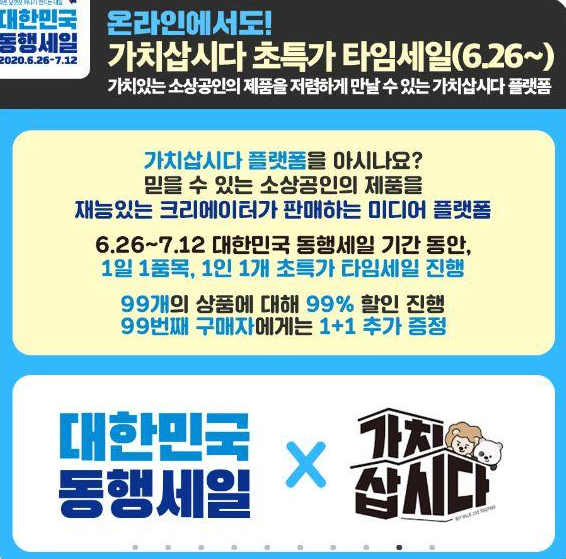 마지막으로 가치 삽시다라는 주제로 대한민국 온라인 동행 세일에서는 세일 기간 동안 1일 1 품목 1인 1개 초특가 타임세일이 진행될 예정입니다.