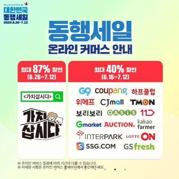 동행 세일 온라인 커머스에는 가치 삽시다의 주제로 최대 87%의 할인으로 G9, 쿠팡, 하프클럽, 위메프, CJ몰, 티몬, 보리보리, 오아시스, 11번가, G마켓, 옥션, 카카오 파머, 인터파크, 롯 데온, SSG, GS플래시 대한민국 대표 온라인 판매몰이 대거 참여하였습니다.