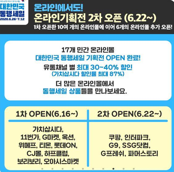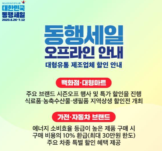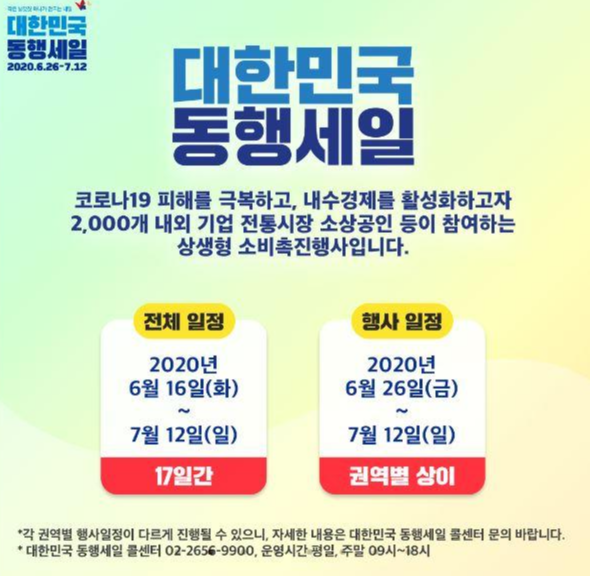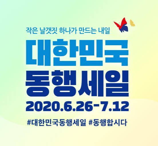 대한민국 동행 세일은 대대적 특별 할인 행사로 2020.06.26일부터 ~ 2020.07.12일까지 2주간에 걸쳐 집중적으로 개최됩니다.