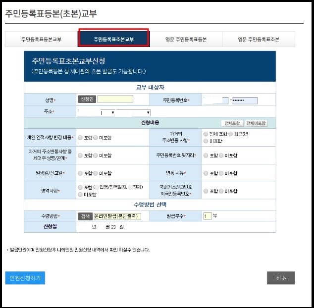 주민등록초본을 발급받고자 하는 사람의 명의로 정보를 기입하면 됩니다. 필요한 정보를 모두 입력했다면 하단의 신청하기 버튼을 눌러줍니다.
