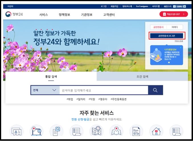 해당 민원 서비스를 이용하기 위해서는 로그인이 필요합니다. 민원24에 로그인 할 수 있는 방법에는 여러가지가 있으니 본인이 편리한 방법으로 로그인을 해주시면 되겠습니다.