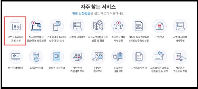 민원24시 또는 정부24시 홈페이지에 들어오셨다면 여러 카테고리들 중에서 찾아야할 곳은 자주찾는 민원중 주민등록등본(초본)교부가 보이실겁니다. 클릭해서 이동합니다.