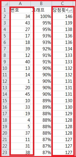 끝까지 봐주신분들을 위해서 보기 좋게 당첨번호와 당첨횟수 엑셀로 보여드릴께요. 참고하세요