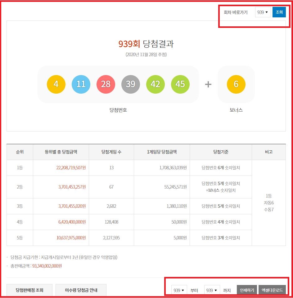 하단의 표시와 같이 1회 차에서 현재 당첨된 회차까지 인쇄 및 엑셀 파일로 다운로드 가능합니다.