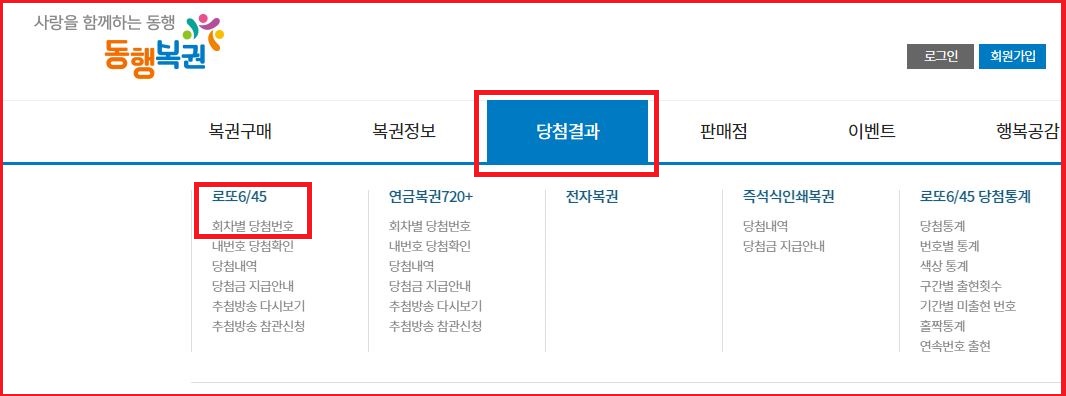 사랑을 함께하는 동행 복권 홈페이지 이동하셨다면 상당의 당첨결과와 로또 6/45 회차별 당첨번호를 클릭합니다.