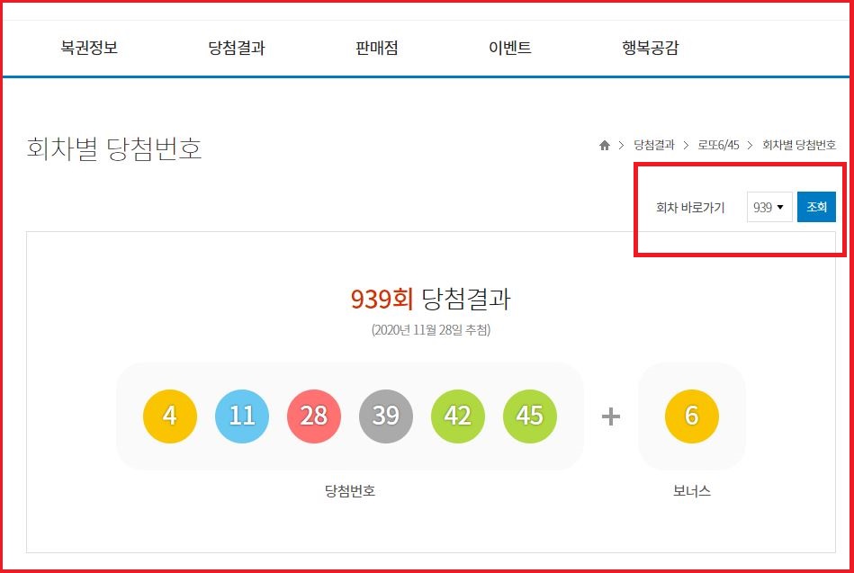 우측 상단에 회차 바로가기에서 1회~ 현재까지 추첨한 로또복권 당첨결과를 확인할 수 있습니다.