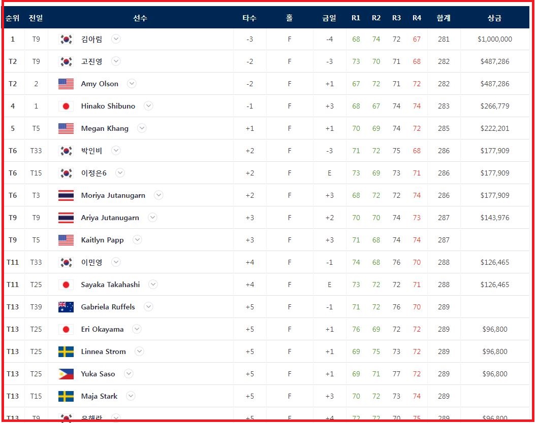 하단으로 내려다보시면 선부 개개인별 정보사항이 나타납니다. 최종 타수, 현재 호르 금일 타수, 라운드별 타수 및 선수 개개인의 상금까지 나타납니다.