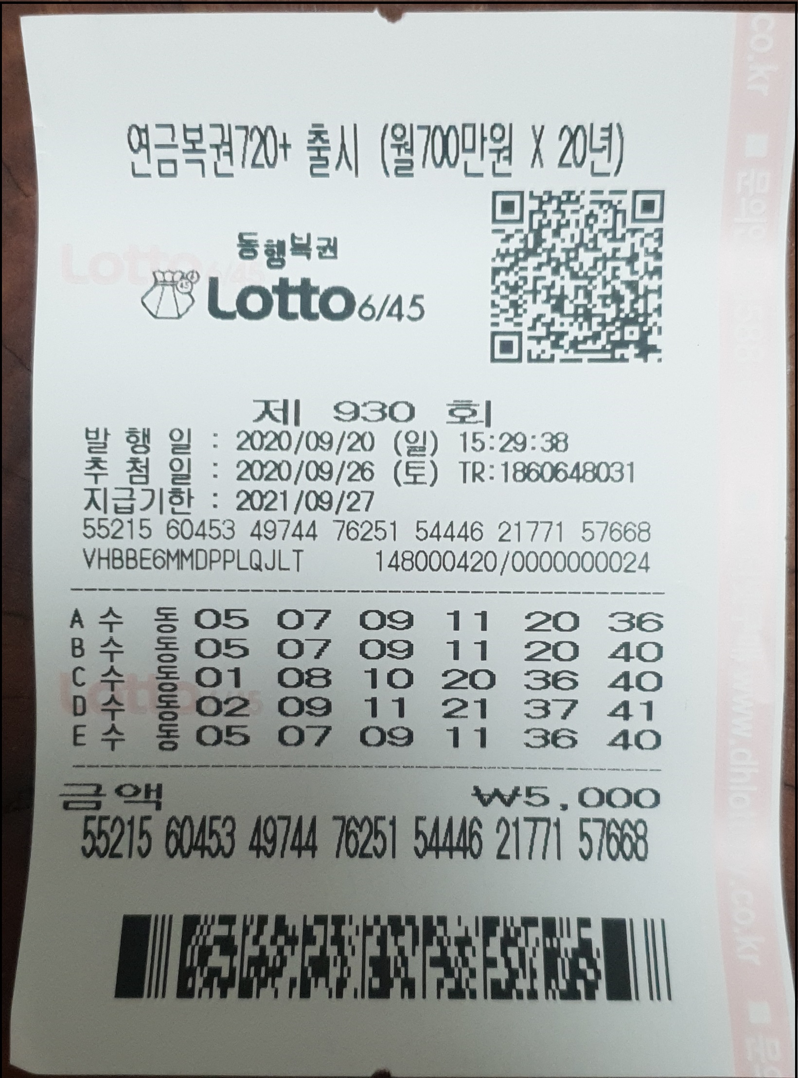 발행일 2020년 09월 20일 일요일 / 추첨일 2020년 09월 27일 토요일 20시 45분, 6일 있다가 1등 당첨되는 행운이 나에게 진짜 왔으면 좋겠네요.