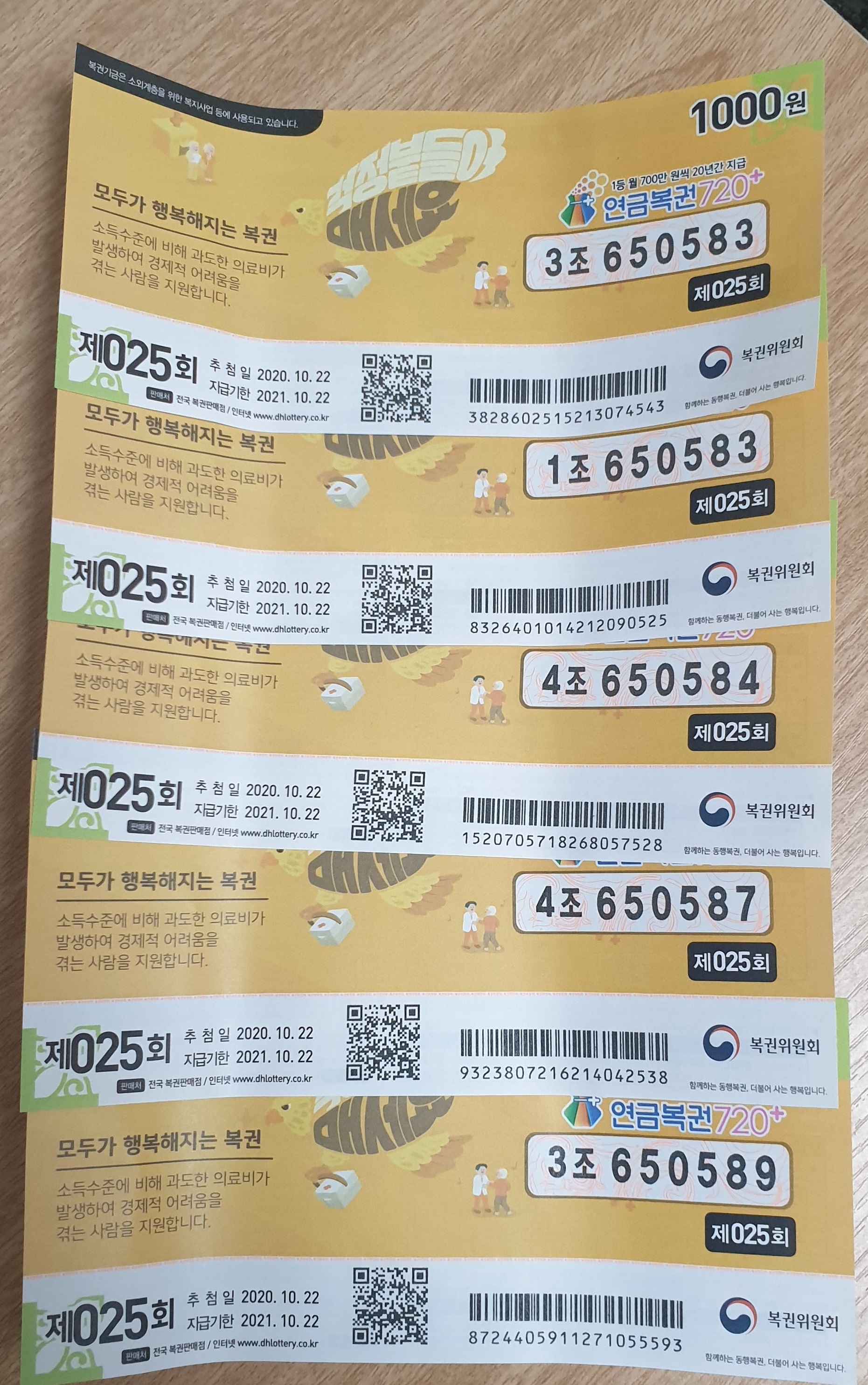 연금복권 720 25회 자동번호 5,000원 이번 주에도 어김없이 구매하고 세금 떼고 월 546만 원 또는 월 78만 원 허망한 꿈이지만 매주의 즐거움을 느끼고 이 부장에게 받는 스트레스 풀고자 어김없이 도전하고 도전합니다.