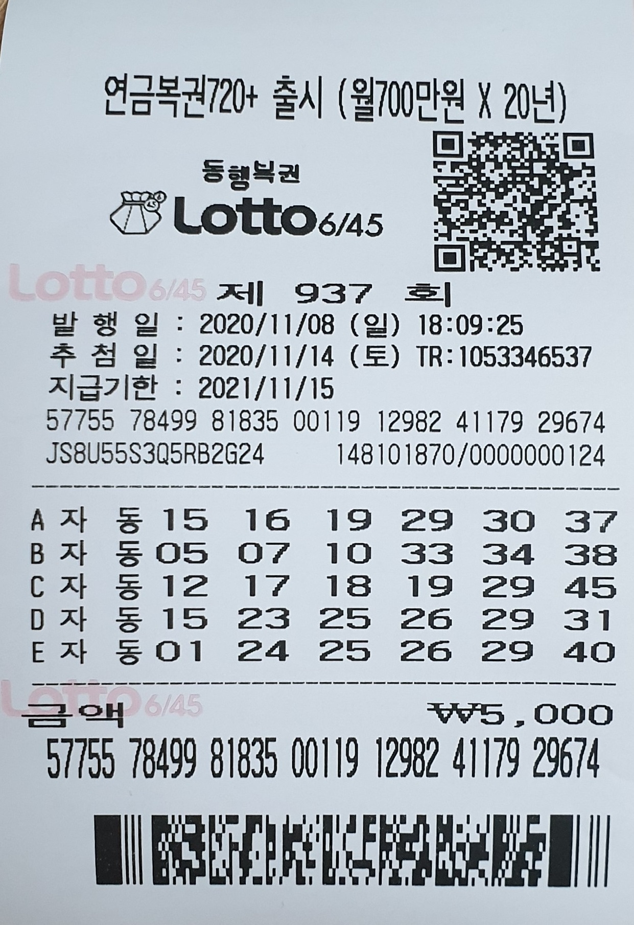구매자는 원하는 번호를 선택해서 구입할 수 있고 1등 당첨자가 없는 경우에는 해당 당첨금은 다음 회차 1금 당첨금으로 이월됩니다. 이와 가은 동행 복권 나눔로또는 대한민국에서 2002년 12월에 시작된 최고 당첨금액의 제한이 없는 복권입니다. 더도 말고 덜도 말고 로또 1등 당첨자 1명일때 당첨되고자 하는 바램으로 이번주 동행복권 로또 제937회 자동 예상번호 운 세한 번 봐봅니다.