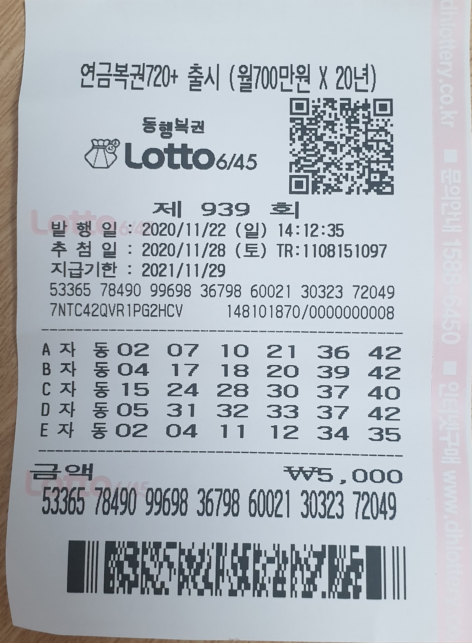 로또제939회 예상번호 자동번호 발행일 2020년 11월 22일 일요일 / 추첨일 2020년 11월 28일 토요일 20시 45분 로또번호 일정 마무리합니다.