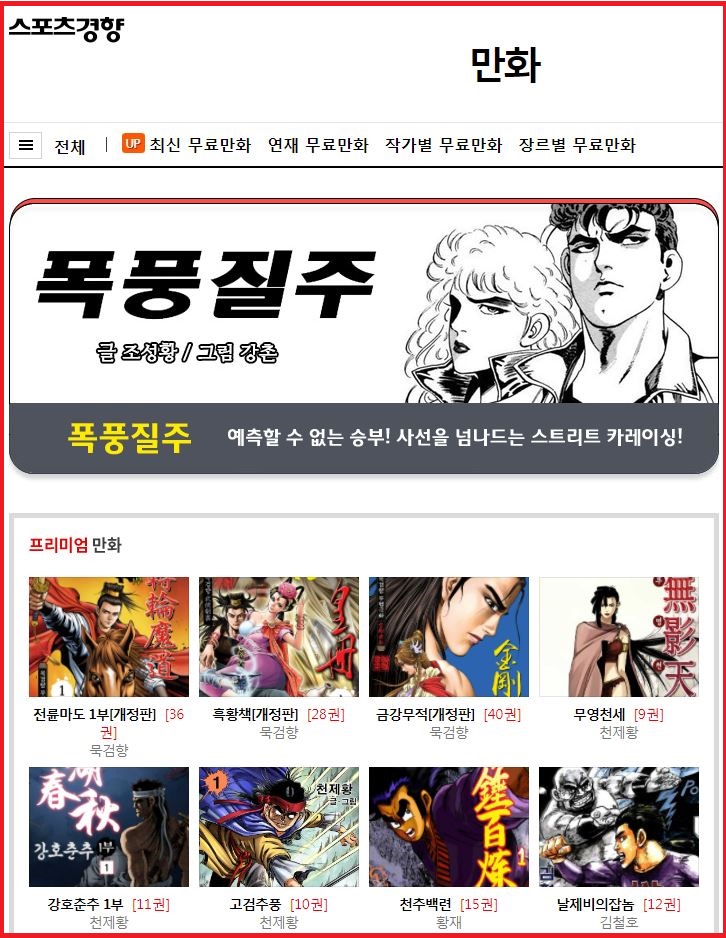 스포츠경향 홈페이지로 이동하셨다면 상단의 만화 메뉴가 보이면 선택합니다.