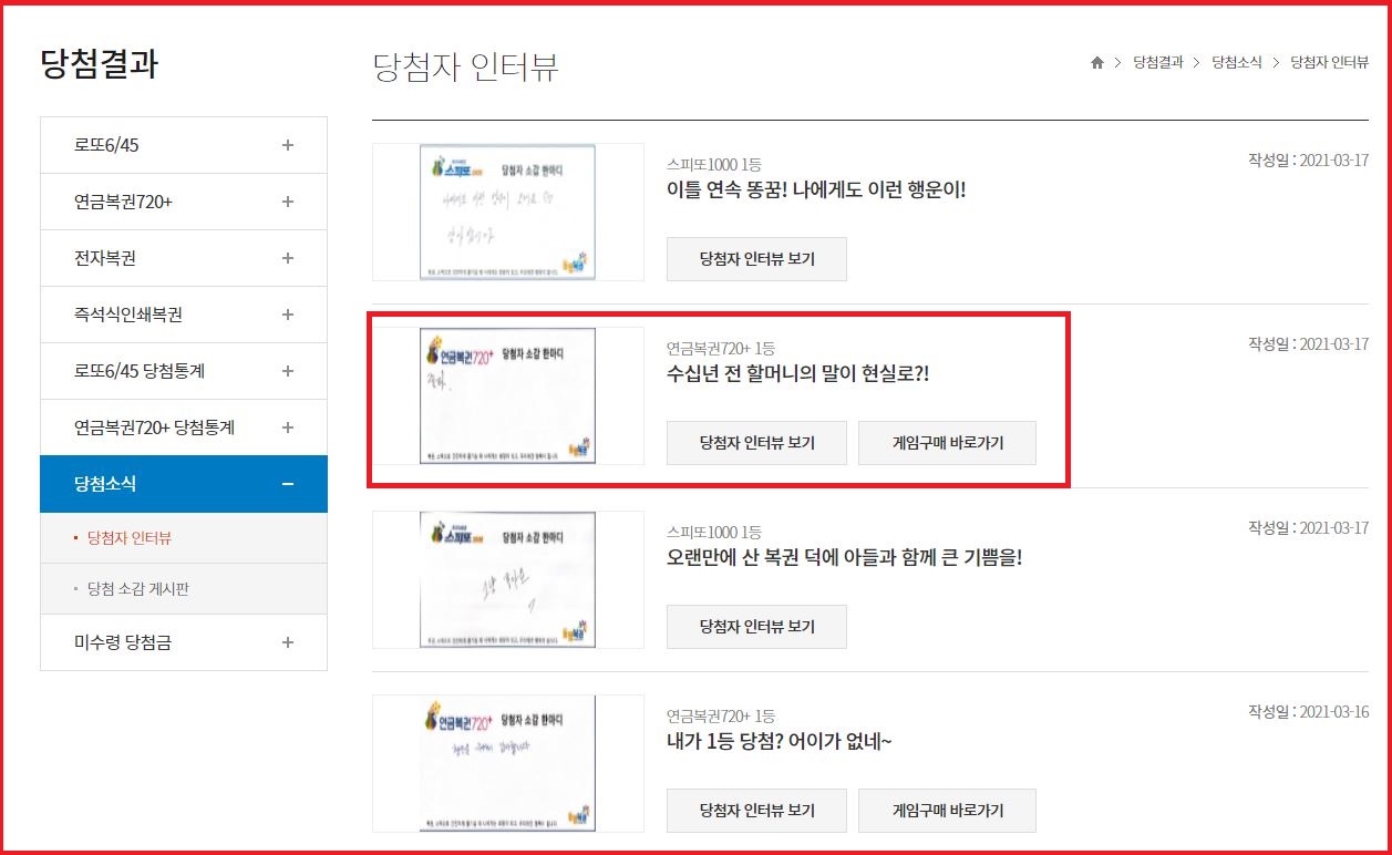 당첨소식에는 당첨자 인터뷰와 당첨소감 게시판이 나타나는데 당첨자인터뷰가 연금복권 당 첨후기에 대해 확인됩니다.