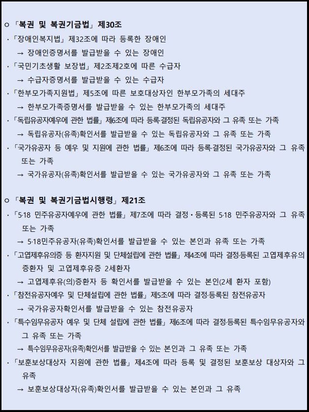 위 내용과 같이 장애인복지법에 의한 장애인, 국민기초생활 보장법에 의한 기초생활 수급자, 보호대상자인 한부모가족 세대주, 독립유공자와 그 유족 또는 가족, 국가유공자와 그 유족 또는 가족, 5.18 민주유공자와 유족 또는 가족, 고엽제후유의증환자 및 고엽제휴유증 2세환자, 참전유공자, 특수임무유공자와 그 유족 또는 가족, 보훈보상대상자와 그 유족이 우선계약자와 차상위계층에 포함된다고 보면 됩니다.