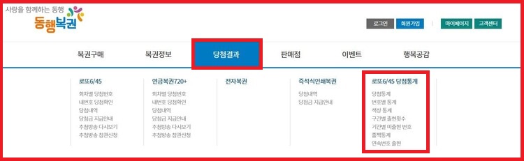 동행복권 홈페이지로 이동하면 상단의 당첨결과 > 로또6/45 당첨통계를 선택합니다.