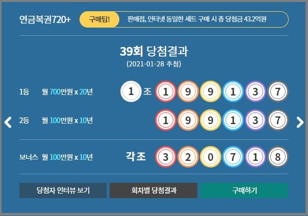 2021년 01월 28일 목요일 성사스럽게 추첨된 연금복권 720+ 제39회 공식적인 당첨자 발표가 있었습니다.