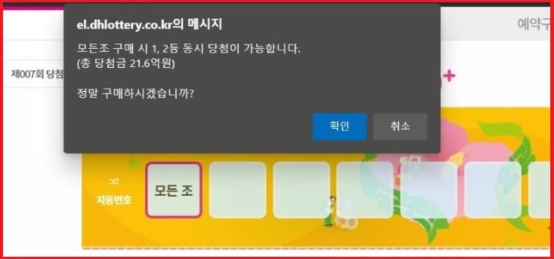 모든 조를 선택하고 자동번호를 생성하게 되면 조만 다르고 나머지 번호는 동일하게 나타나고, 이런경우에는 1등과 2등이 함께 당첨되는 1,2등 묶음 당첨자가 되는 것입니다.