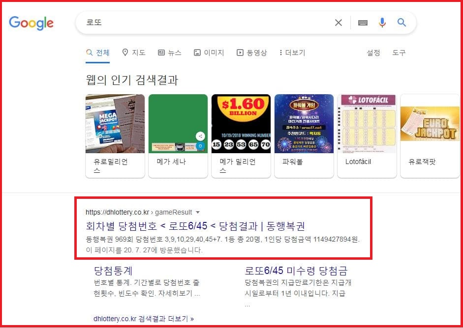 네이버, 다음, 구글, 야후, 줌, 빙등의 검색사이트에서 로또를 검색합니다.