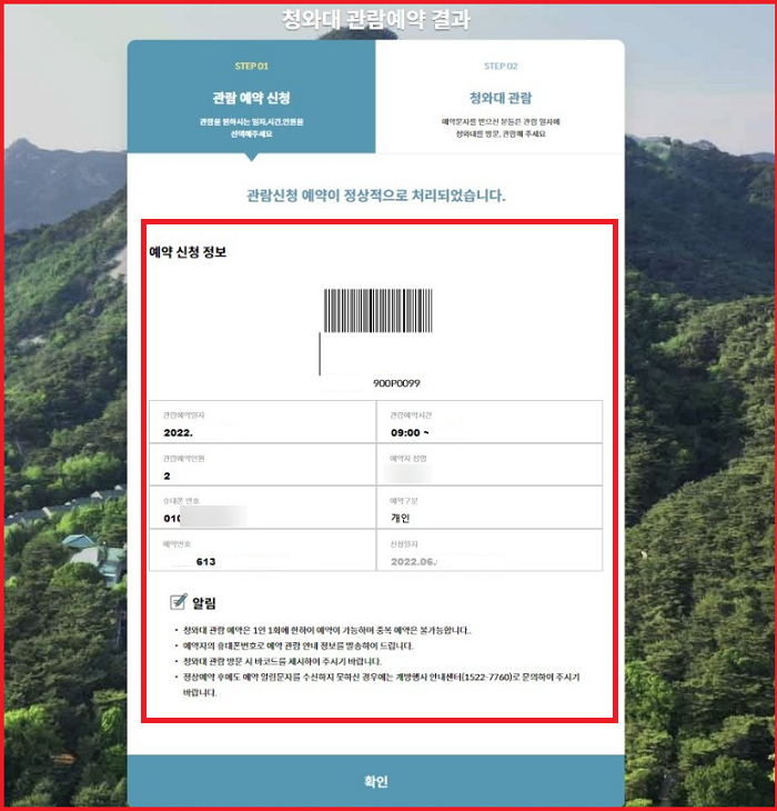 청와대관람예약 완료시 청와대 관람예약 결과가 나타나며 해당 나타난 바코드를 입장시 직원에게 확인시켜주면 입장이 가능합니다.